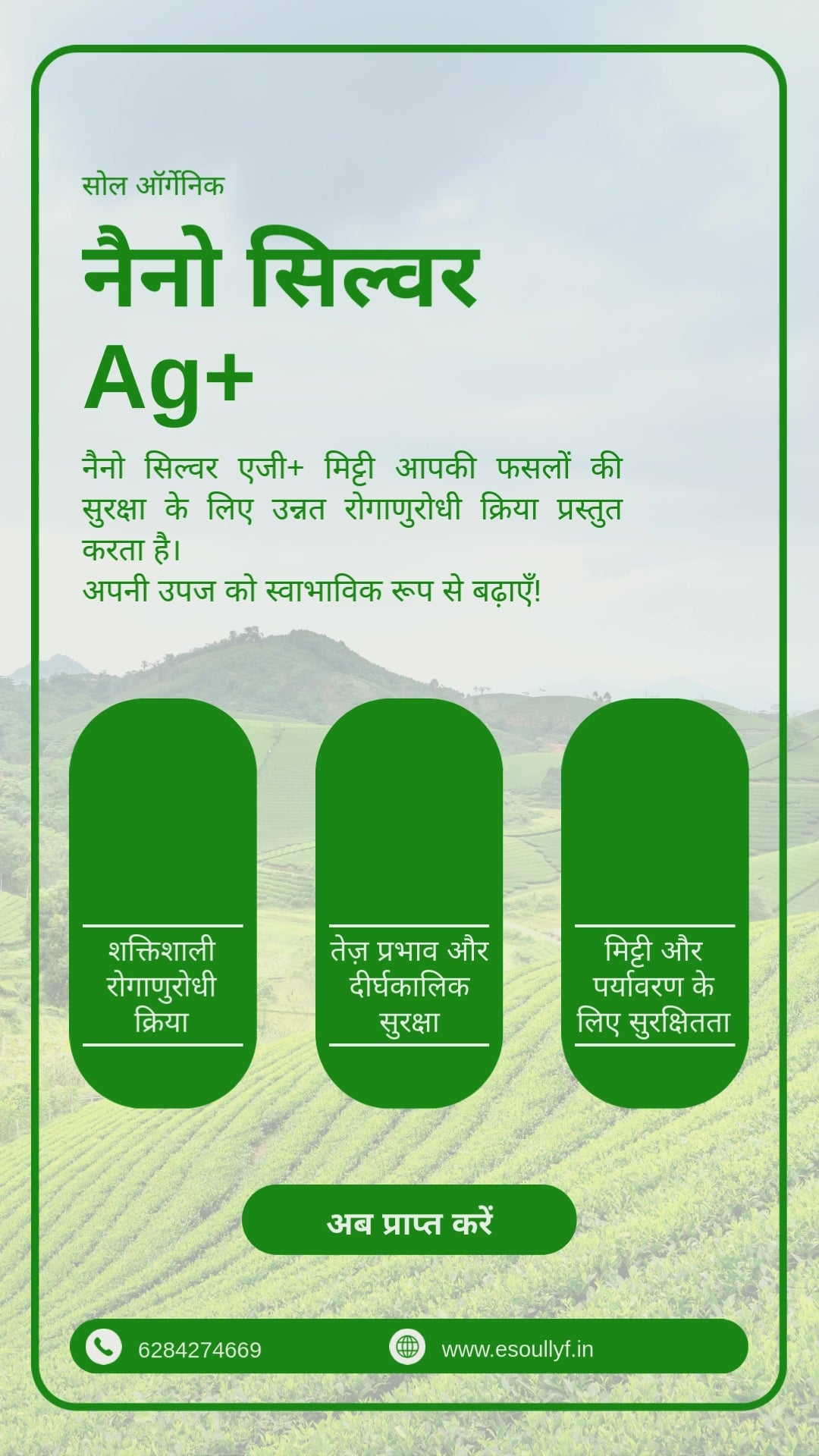 ✨ नैनो सिल्वर Ag+ किसानों को फसलों के लिए सुरक्षित, प्राकृतिक और अवशेष-मुक्त सुरक्षा प्रदान करता है — जिससे उपज बढ़ती है और गुणवत्ता लंबे समय तक बनी रहती है।